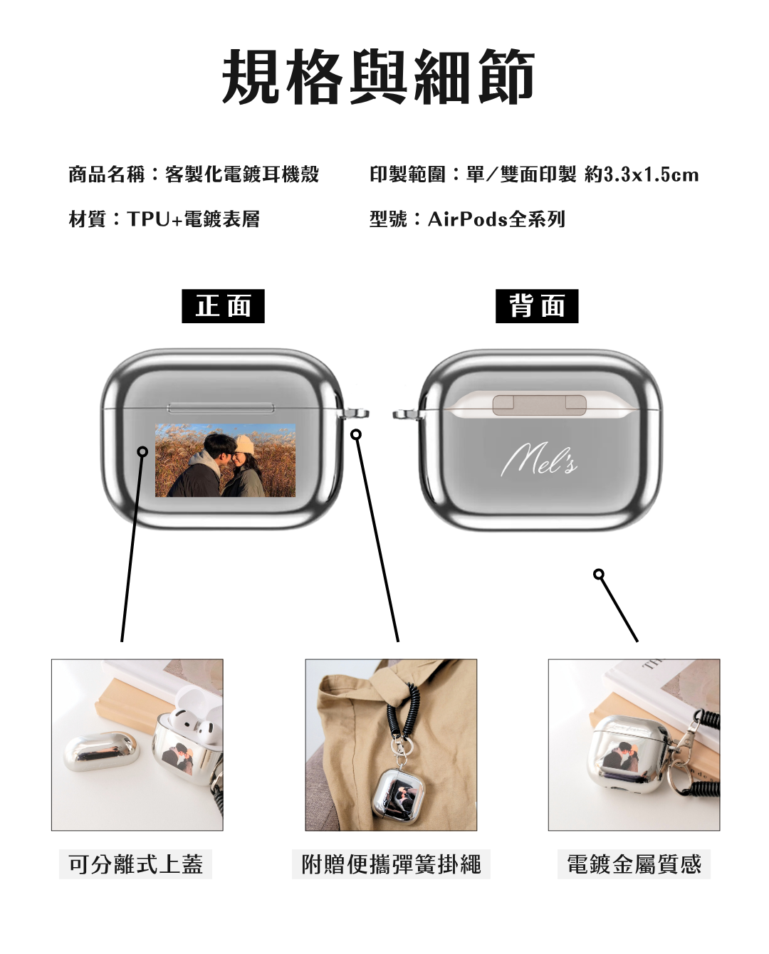 客製化電鍍耳機殼,支援1/2代、Pro至第4代,提供單/雙面印製服務,可印製原圖輸出照片,附掛勾,輕巧便攜,專屬你的質感配件。