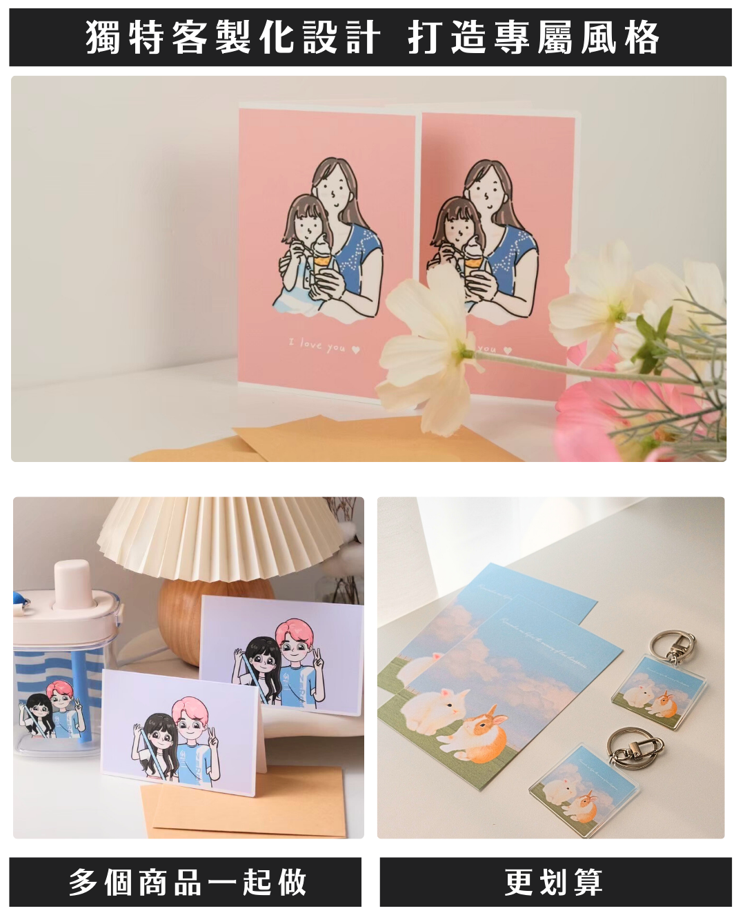 質感印刷對折卡片,搭配似顏繪插畫,高級霧面白卡材質,單面精緻印刷,內頁空白可書寫。心意傳遞,送禮更有溫度。