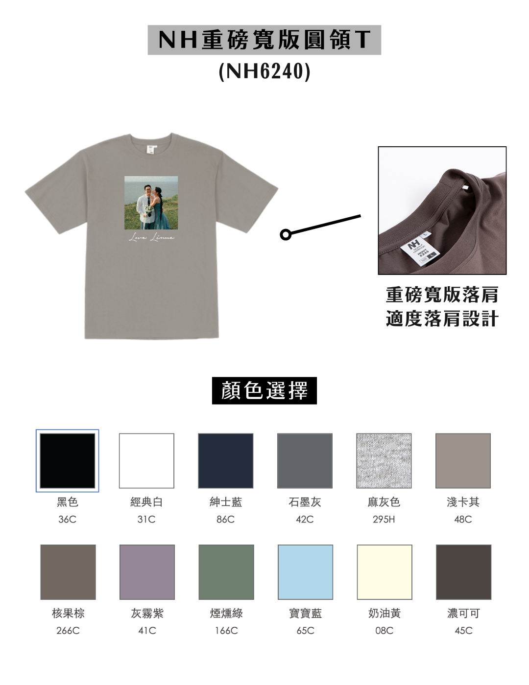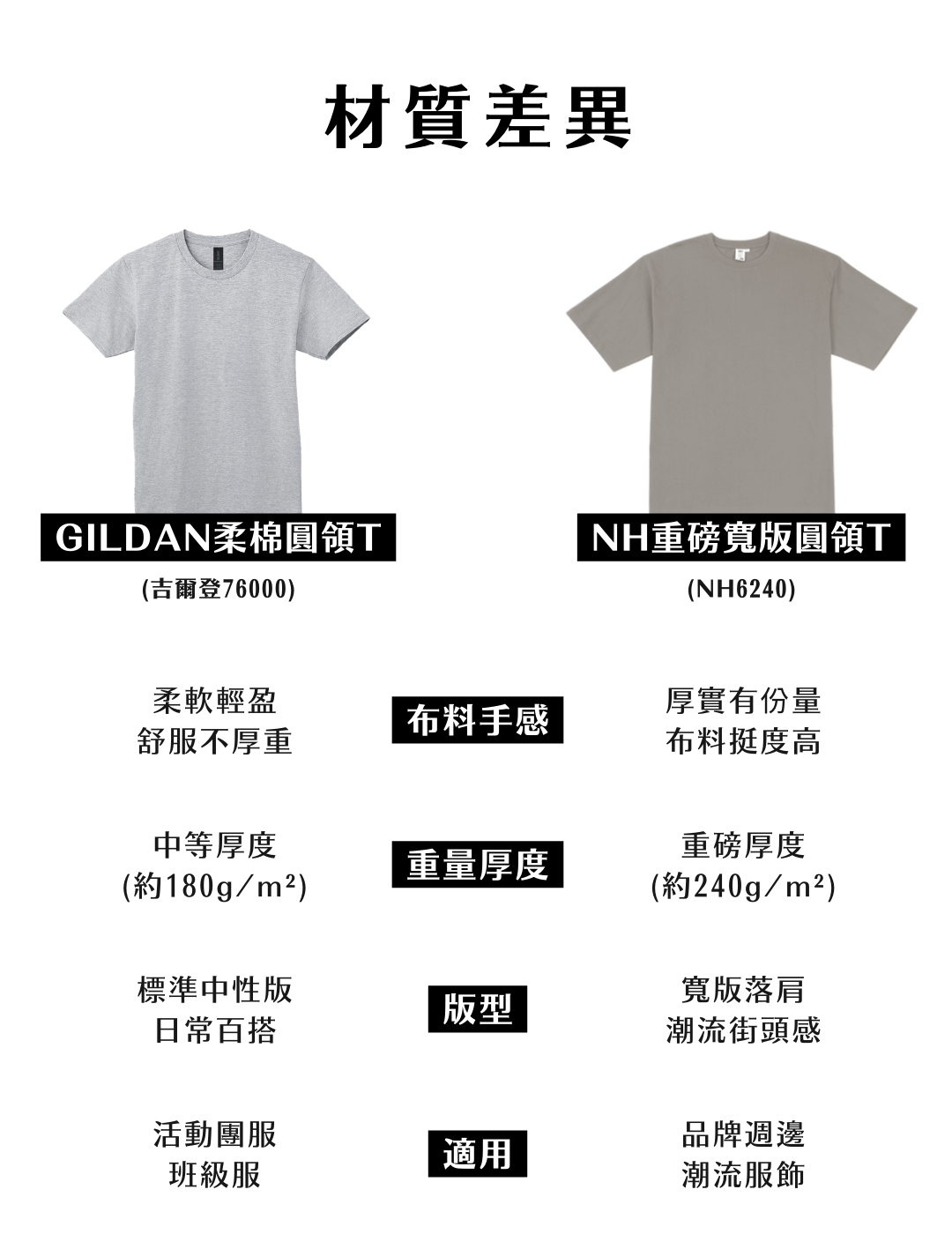 - NH 6240 重磅寬版|7.1oz 約240g 厚實純棉,挺版耐穿、潮流寬鬆,適合品牌週邊、潮流服飾與高質感團體服。