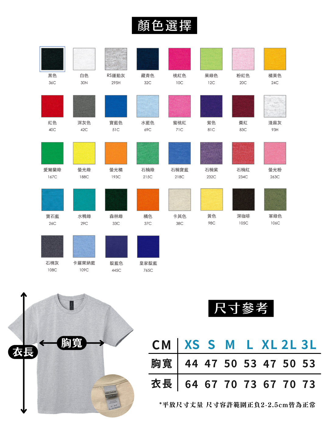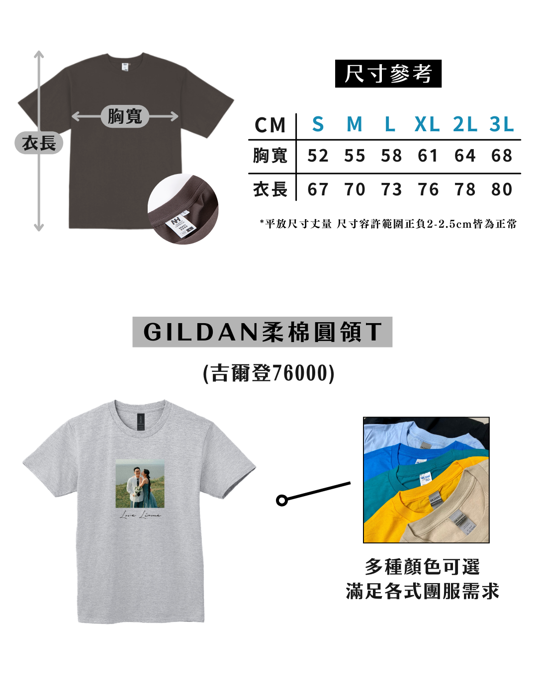 - GILDAN 76000 柔棉中性版|5.3oz 約180g 純棉,輕盈透氣、柔軟舒適,適合日常穿搭、公司制服與活動團體服。