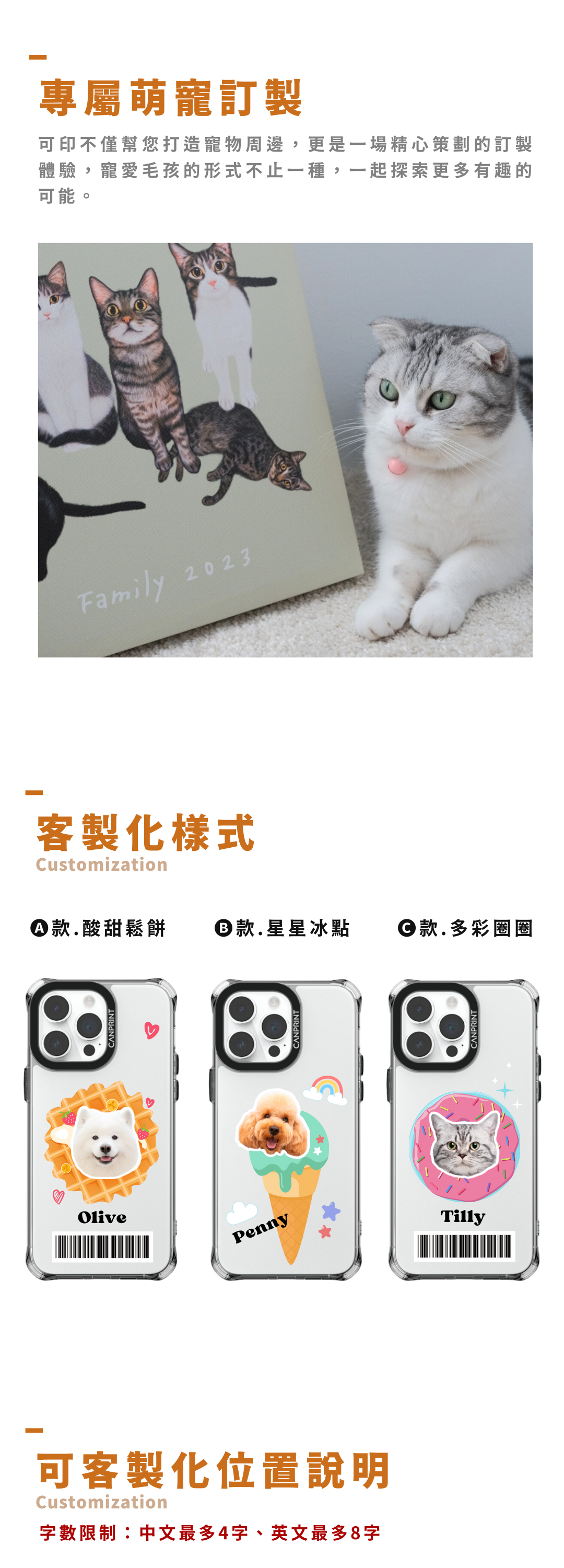客製化萌寵手機殼 × 甜點設計,晶透軍規防摔,TPU彈性邊框、四角氣墊全面防護,專屬毛孩甜美登場,一年保固安心使用