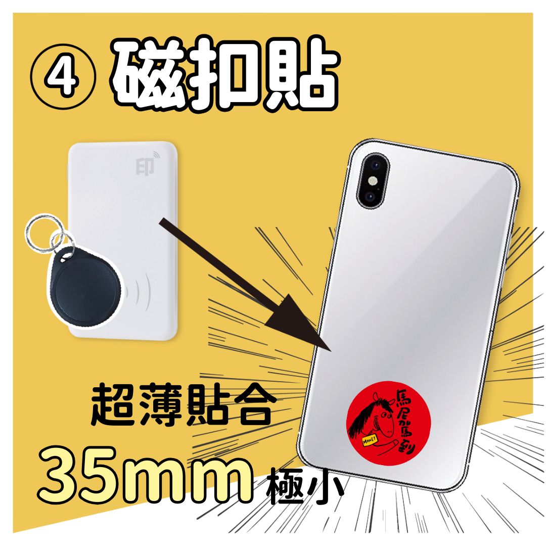 可印磁扣門禁卡貼紙,支援 IC/ID 雙版本,貼在手機即可感應電子鎖、電梯或門禁。PVC 材質+銅線圈抗金屬塗層,感應靈敏穩定,讀寫壽命高達 16 萬次,結合時尚與實用,讓你嗶出品味與個性!