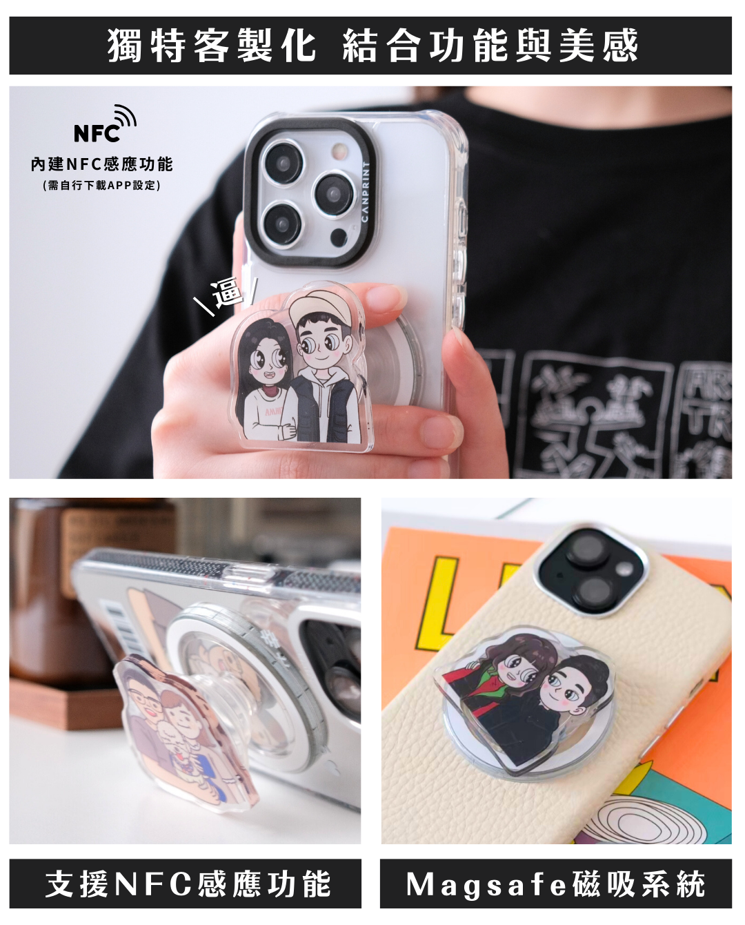商品材質:支架 PC+TPU+強磁(N52 磁鐵),造型圖案壓克力,內建 NFC 晶片
