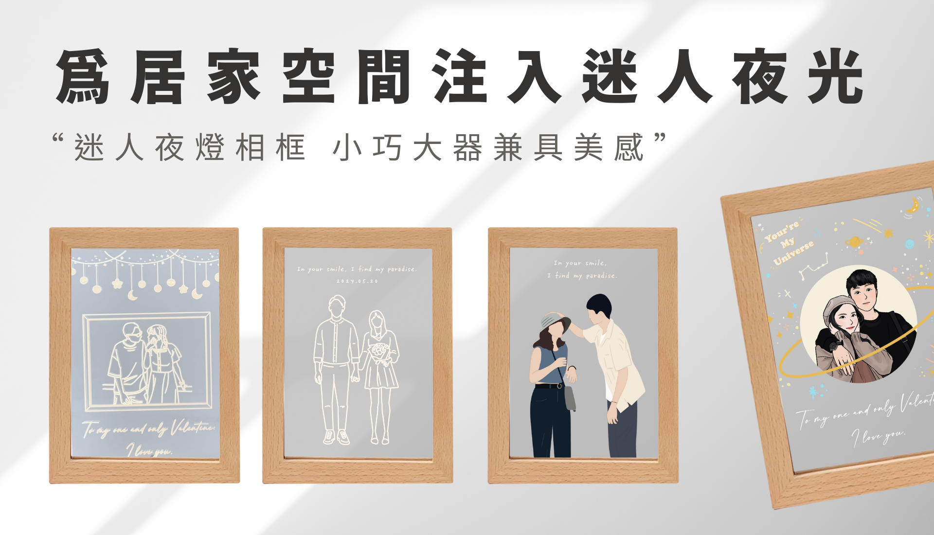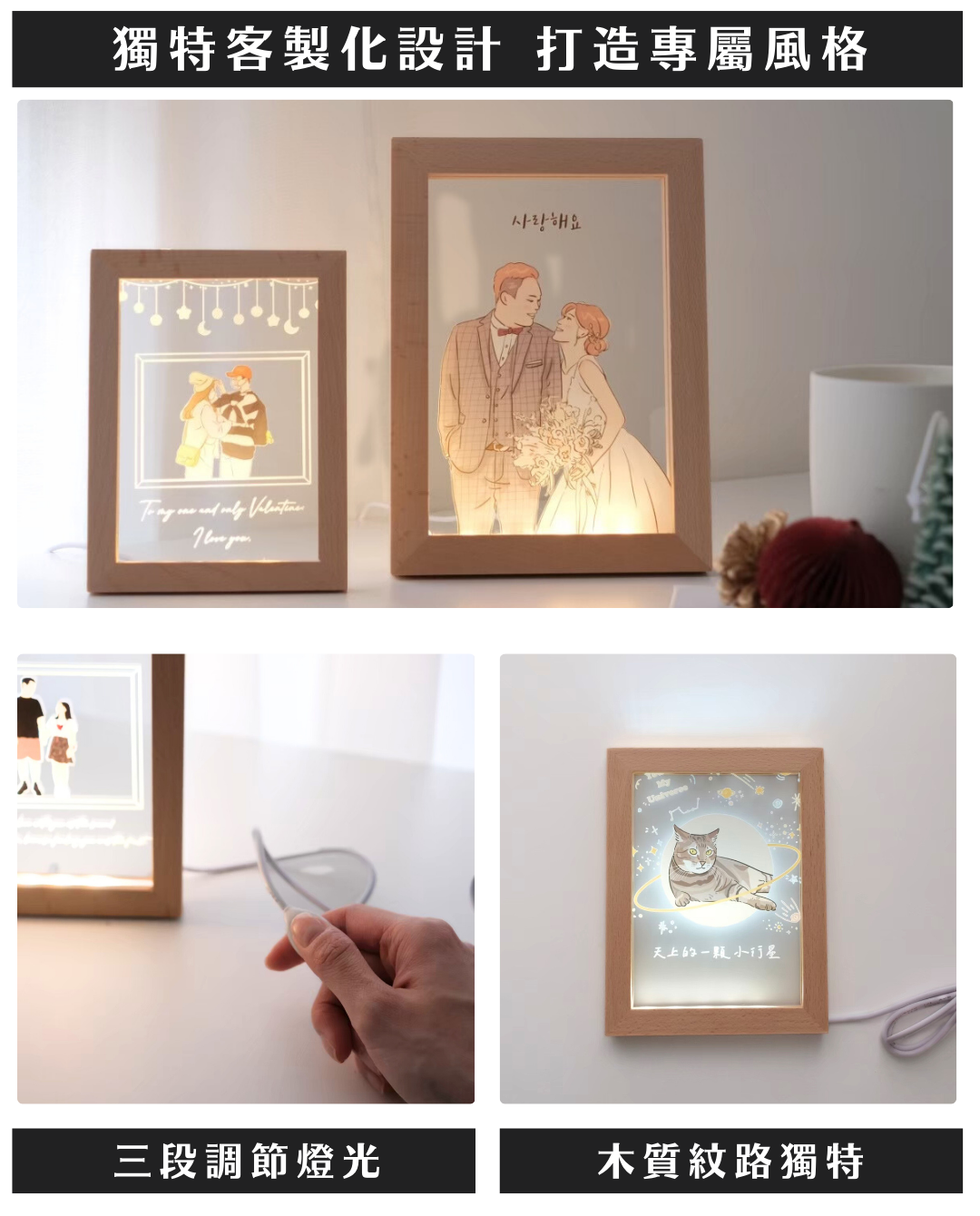 客製化北歐木質夜燈相框,結合似顏繪插圖與三段式燈光,專屬紀念好禮,贈送最有溫度的光影回憶。