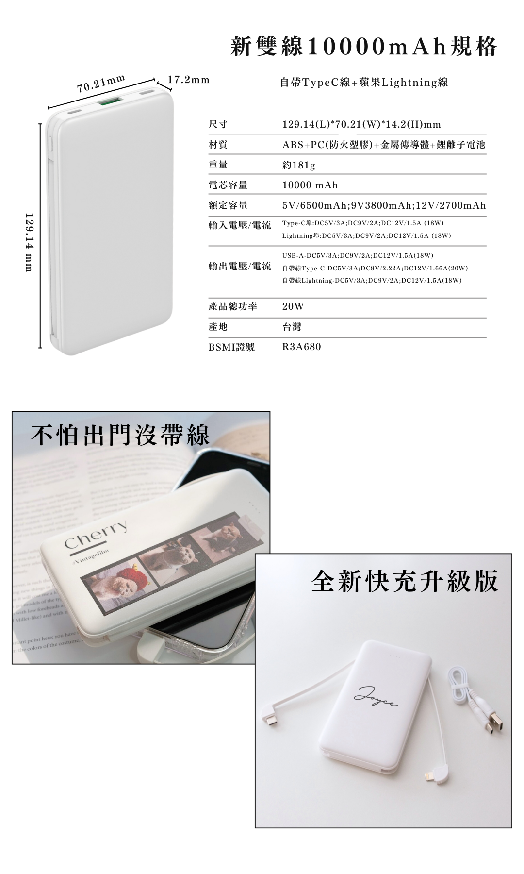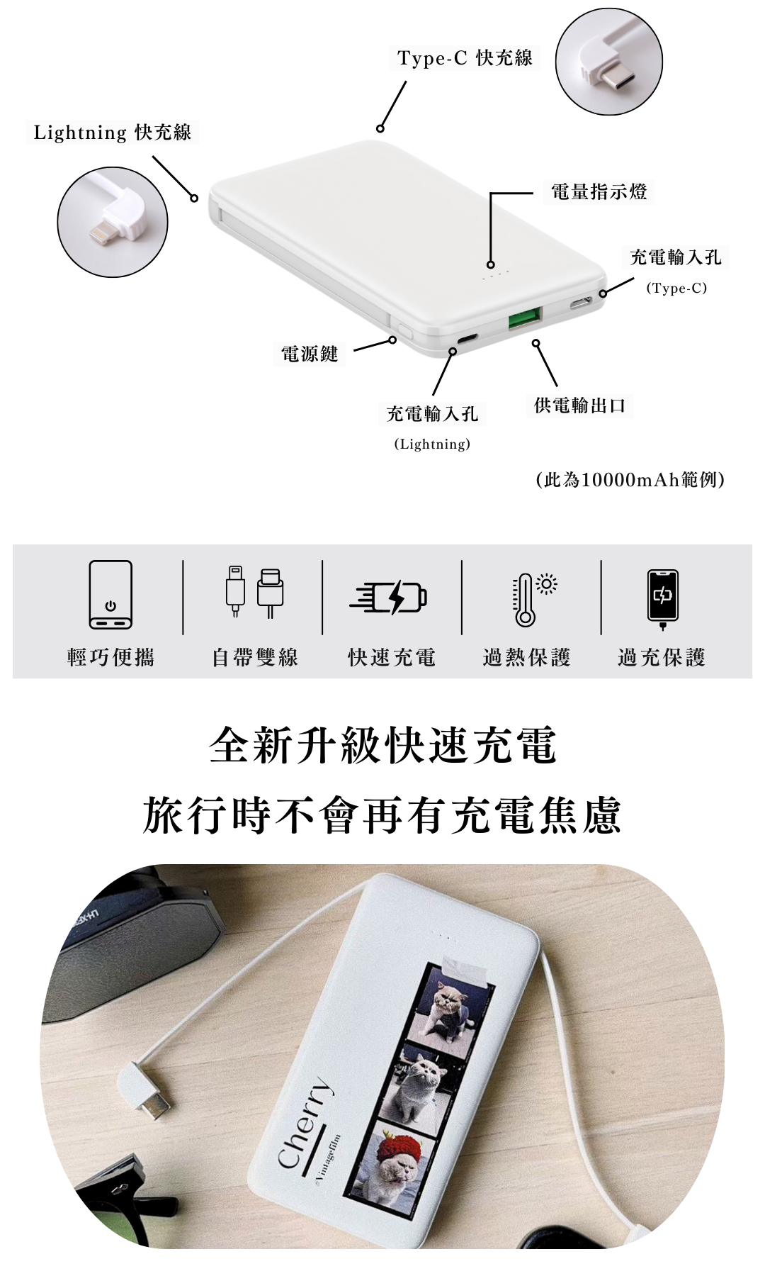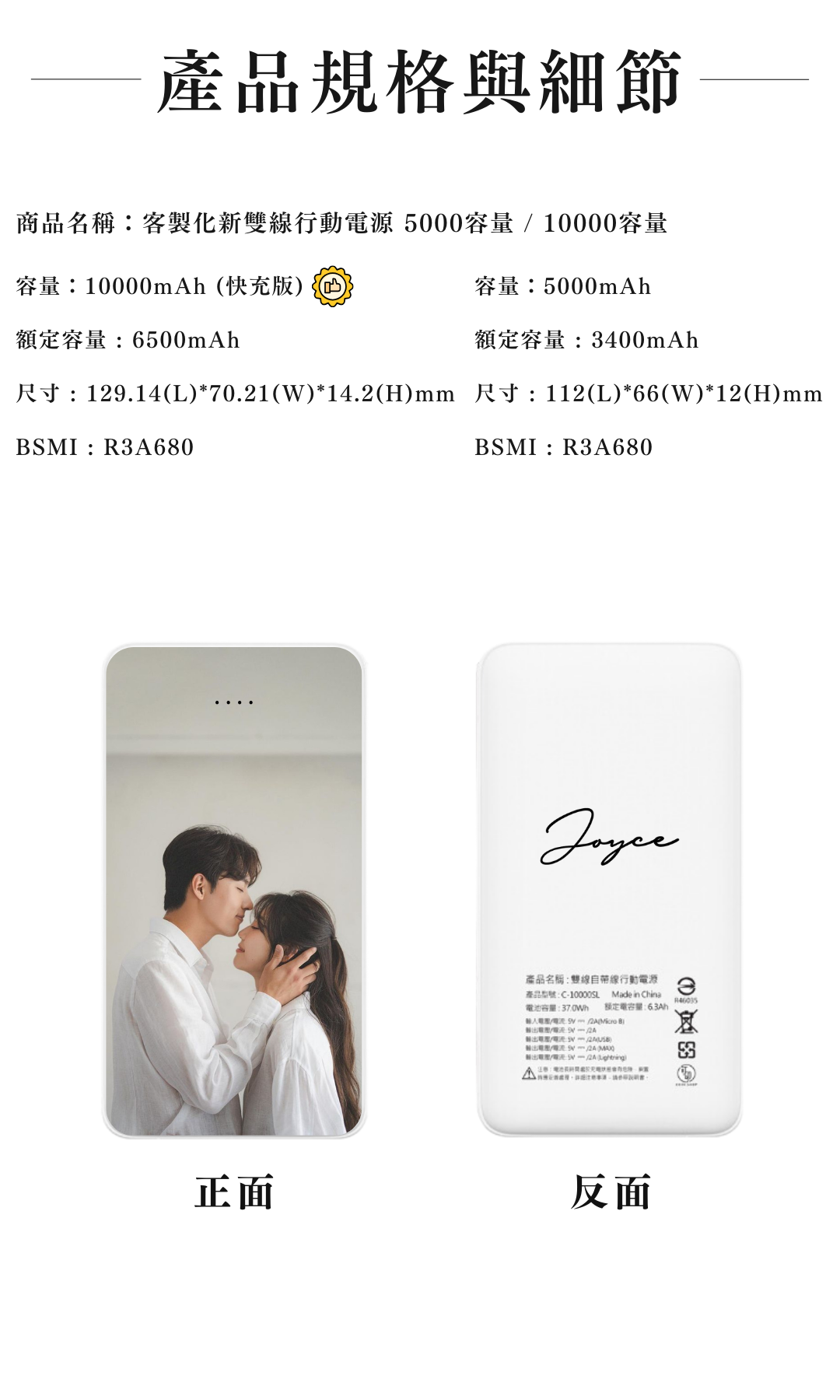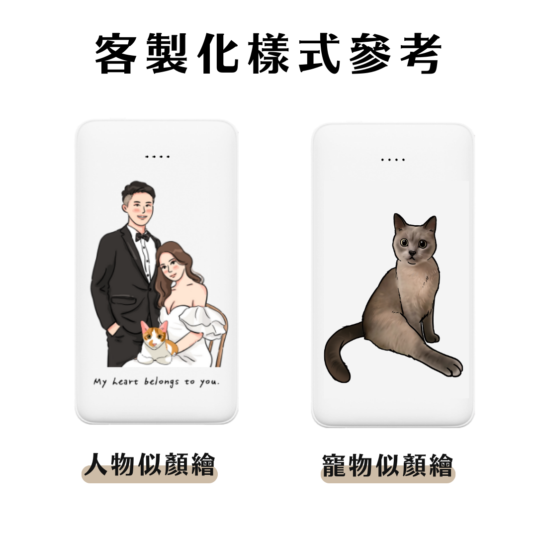 客製化行動電源,新版雙線設計,自帶蘋果與 Type-C充電線,支援似顏繪插畫客製,體積小容量大,快充效率佳,安全有保障(BSMI 認證與 2000 萬責任險保障)