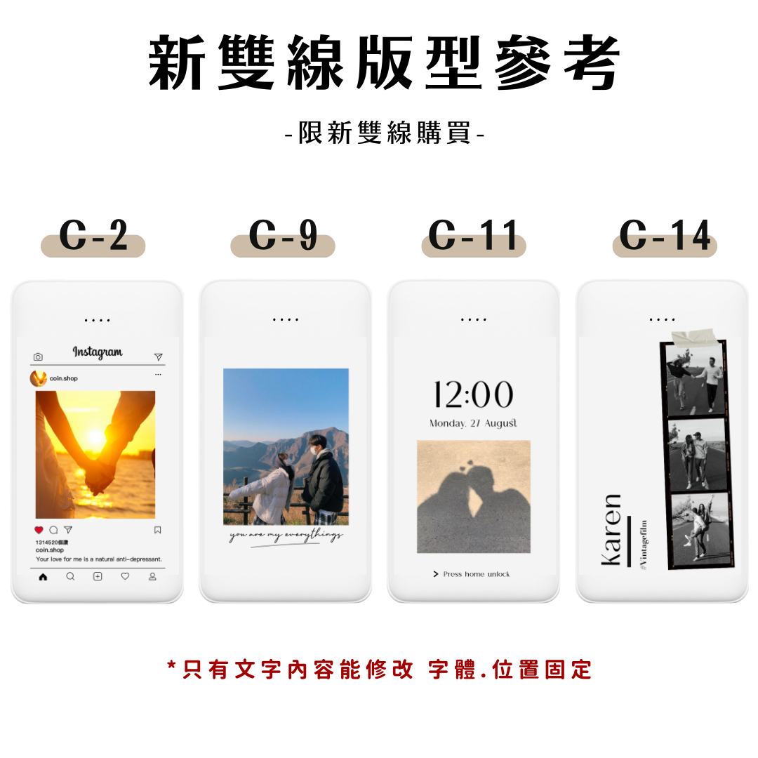客製化行動電源,新版雙線設計,自帶蘋果與 Type-C充電線,搭配多款絕美套版設計,體積小容量大,快充效率佳,安全有保障(BSMI 認證與 2000 萬責任險保障)