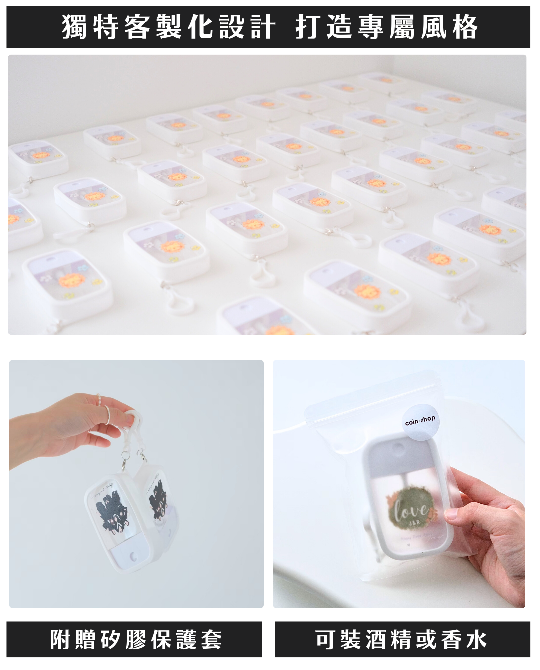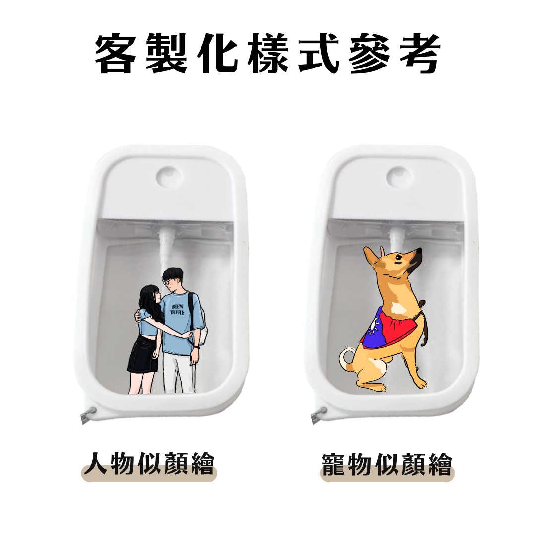 客製化似顏繪隨身噴霧瓶,50ml輕巧扁平設計,附小漏斗與矽膠保護套,雙面滿版印製,外出消毒香氛首選!